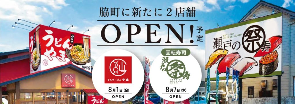 一つの建物に、こだわりの回転寿司「瀬戸の祭り寿司 脇町店」と、讃岐仕込みの自家製麺を誇る「セルフうどんやま 脇町店」が並ぶハイブリッド型店舗です。